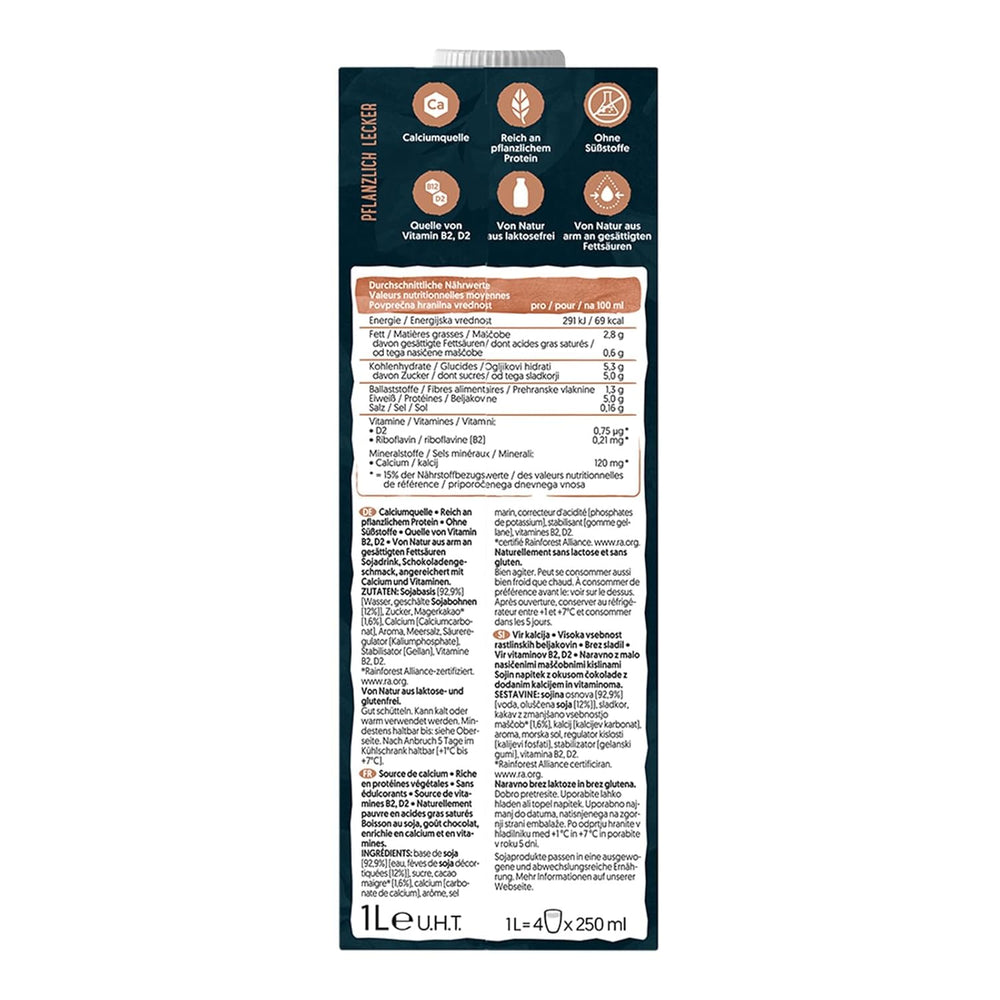 Alpro Proteindrink Soja Chocolate je 100% rostlinný proteinový nápoj určený pro ty, kteří se vyhýbají mléčným výrobkům, ale chtějí bohatý příjem bílkovin. S vyváženou čokoládovou chutí a praktickým balením 8 x 1 L je ideální volbou pro snídaně, svačiny nebo každodenní smoothie.