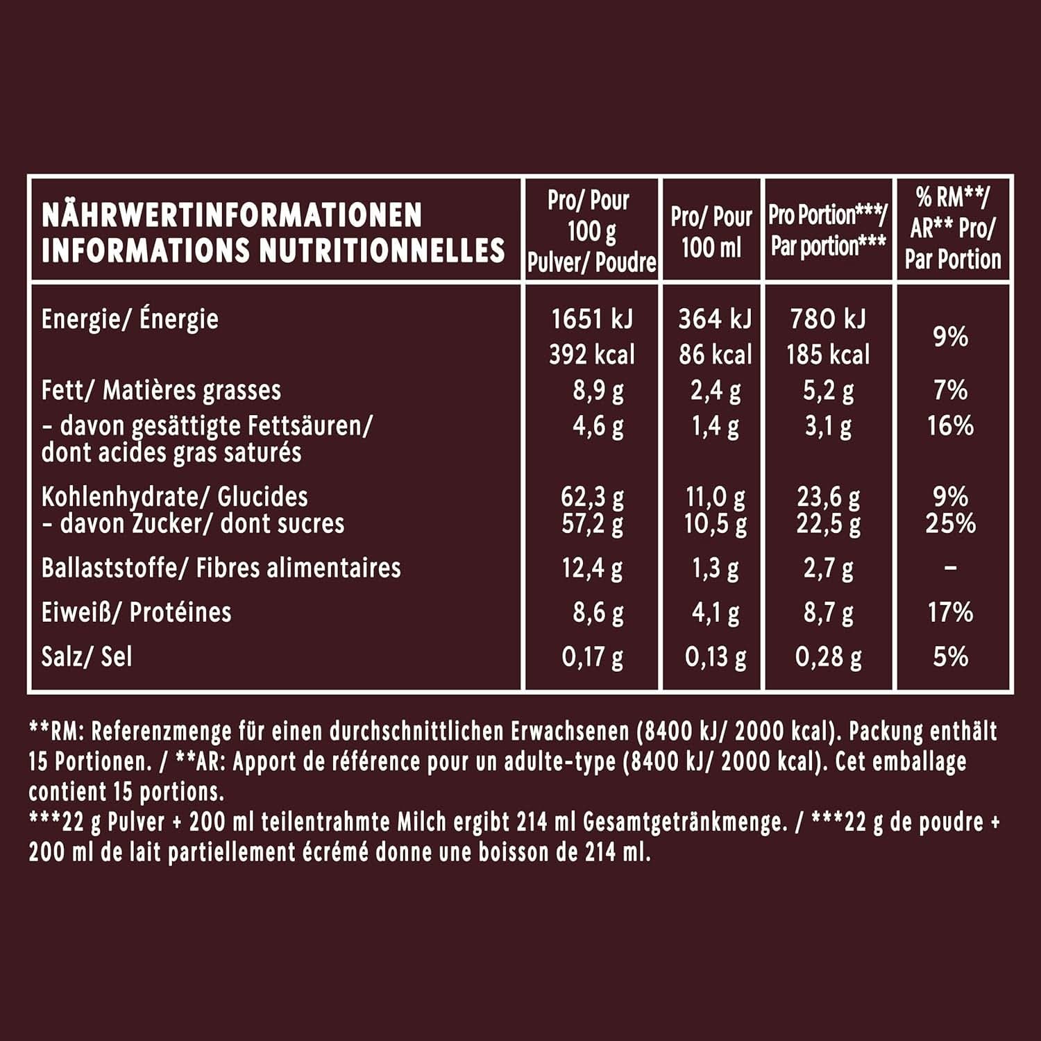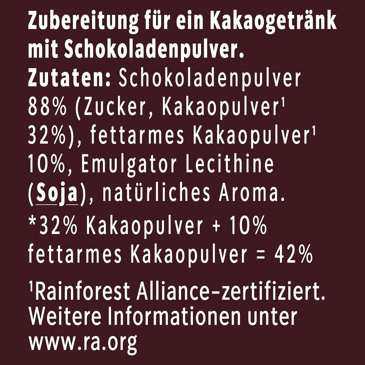Čokoládový prášek 88 % (cukr, kakaový prášek 1 32 %), nízkotučný kakaový prášek 1 10 %, emulgátor lecitiny (SÓJA), přírodní aroma. 1 certifikát Rainforest Alliance.
